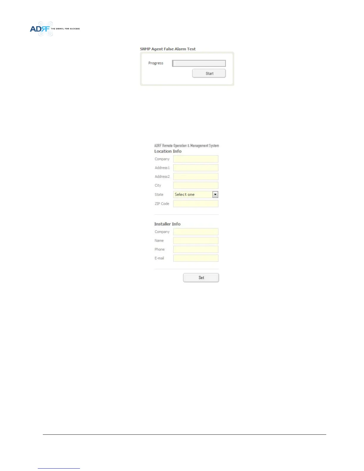 ADRF ADXV-HPR - Figure 7-7 SNMP Agent False Alarm Test (Install - NMS); Figure 7-8 Location Info; Installer Info (Install - NMS)