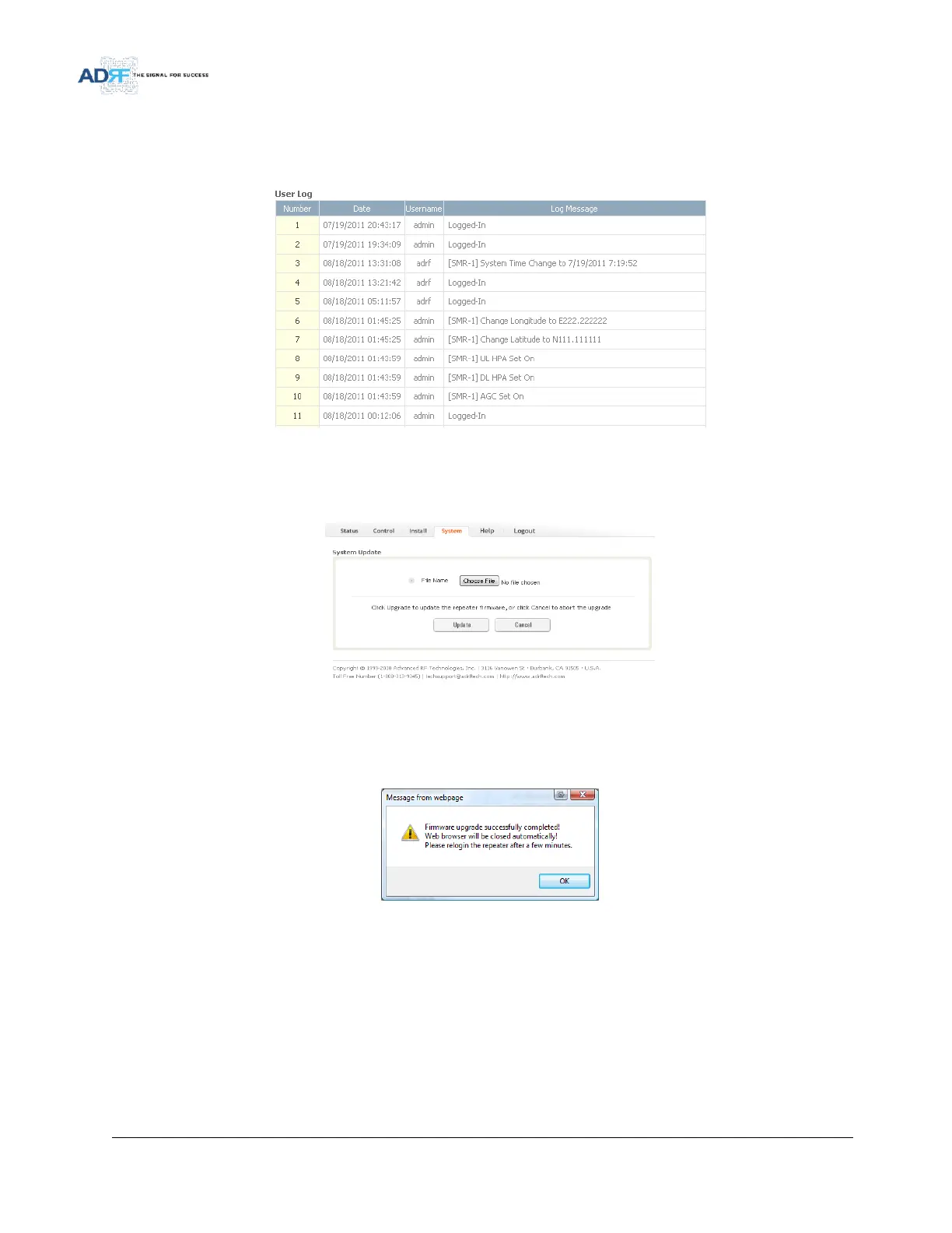 This section displays system events that have taken place. The User Log displays who has made the changes,