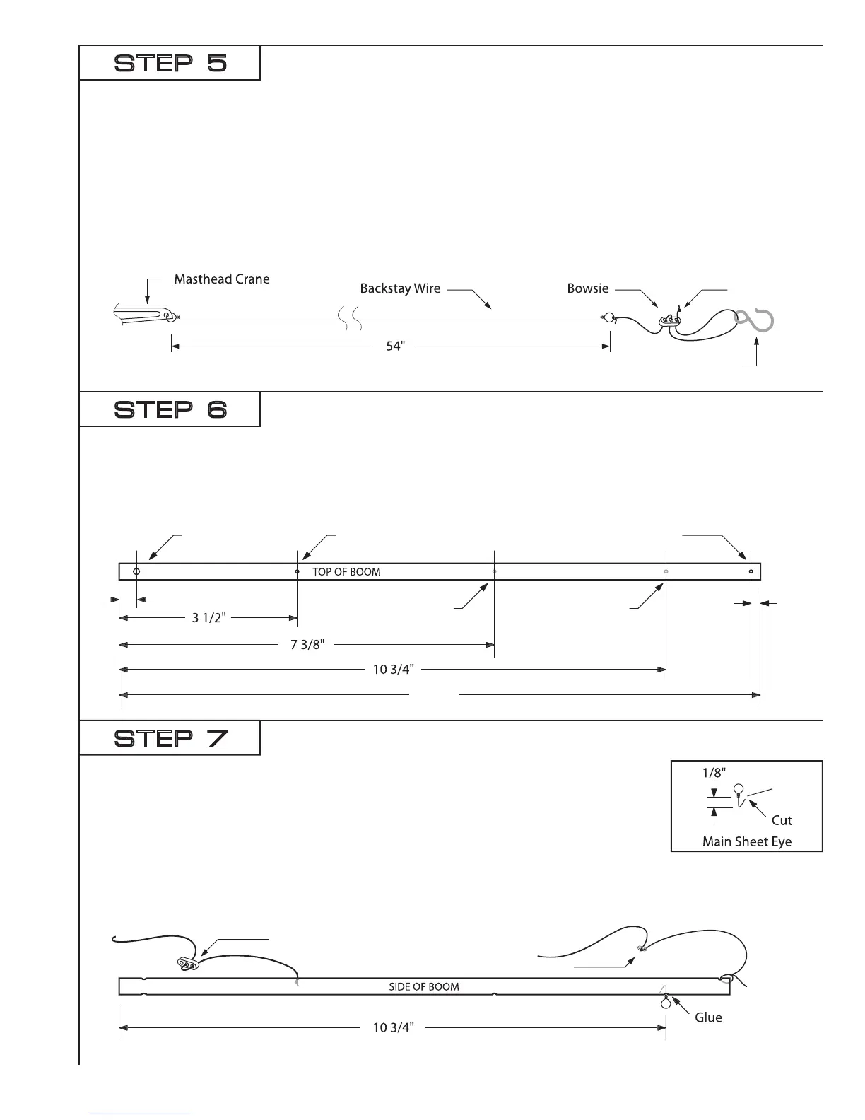 Cut a 60” length of Rigging Wire for the backstay. Attach with Kwik Twist one end of wire to aft hole in Masthead Crane.