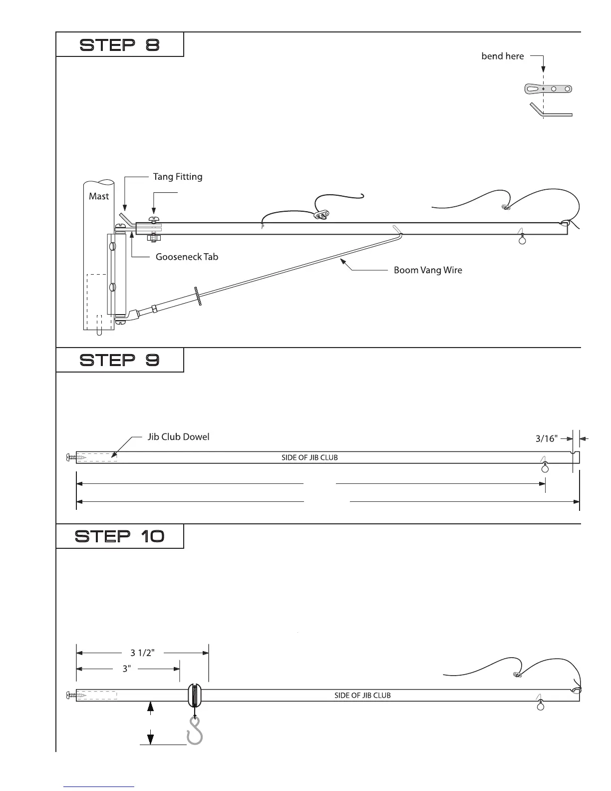 Vang Wire up into the 1/16” dia. hole in bottom of Boom. Position Tang Fitting on top of the Gooseneck