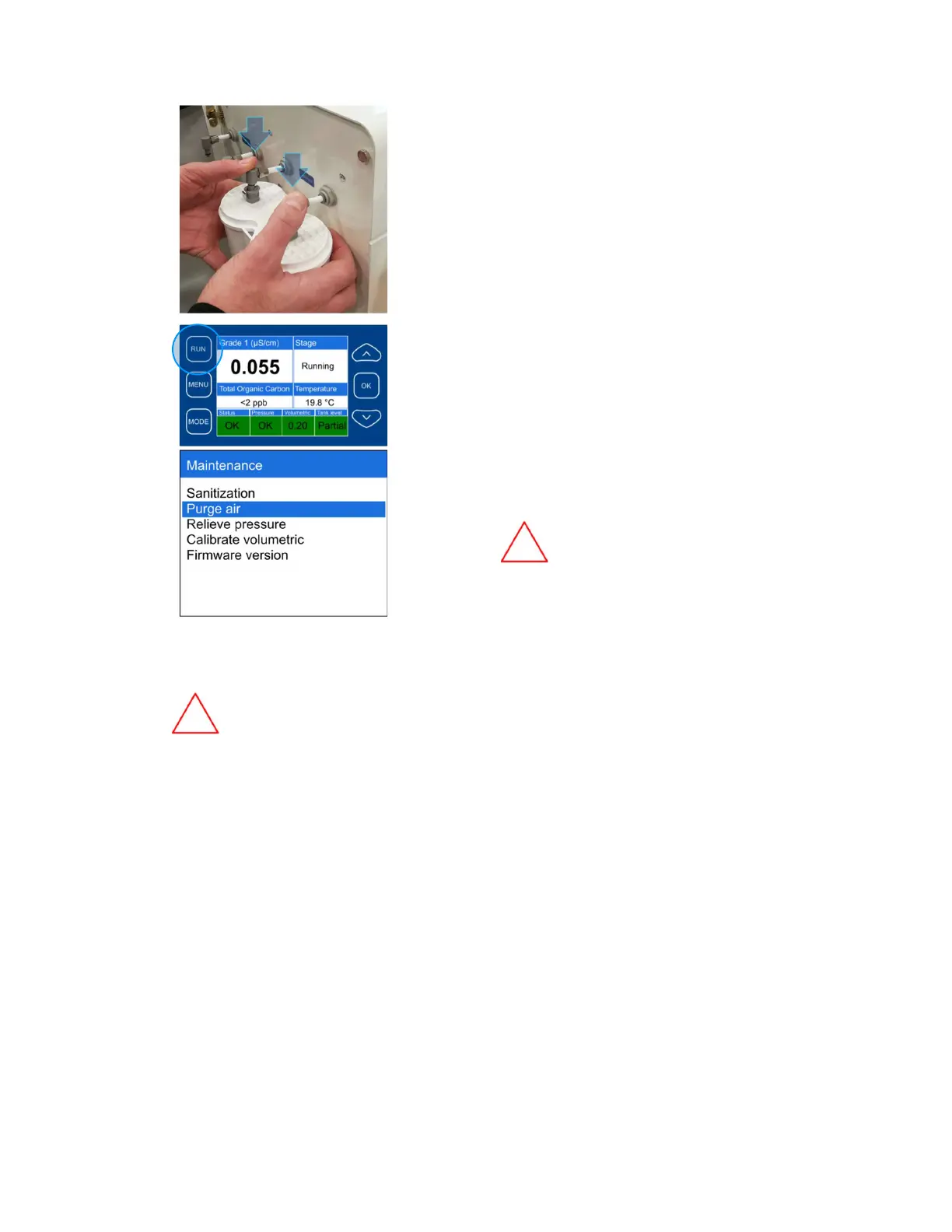- Allow unit to run for 2 hours to decrease TOC level and decrease output conductivity.