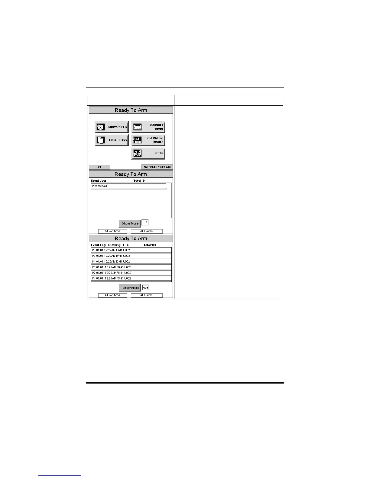 control panel, the "Event Log" screen