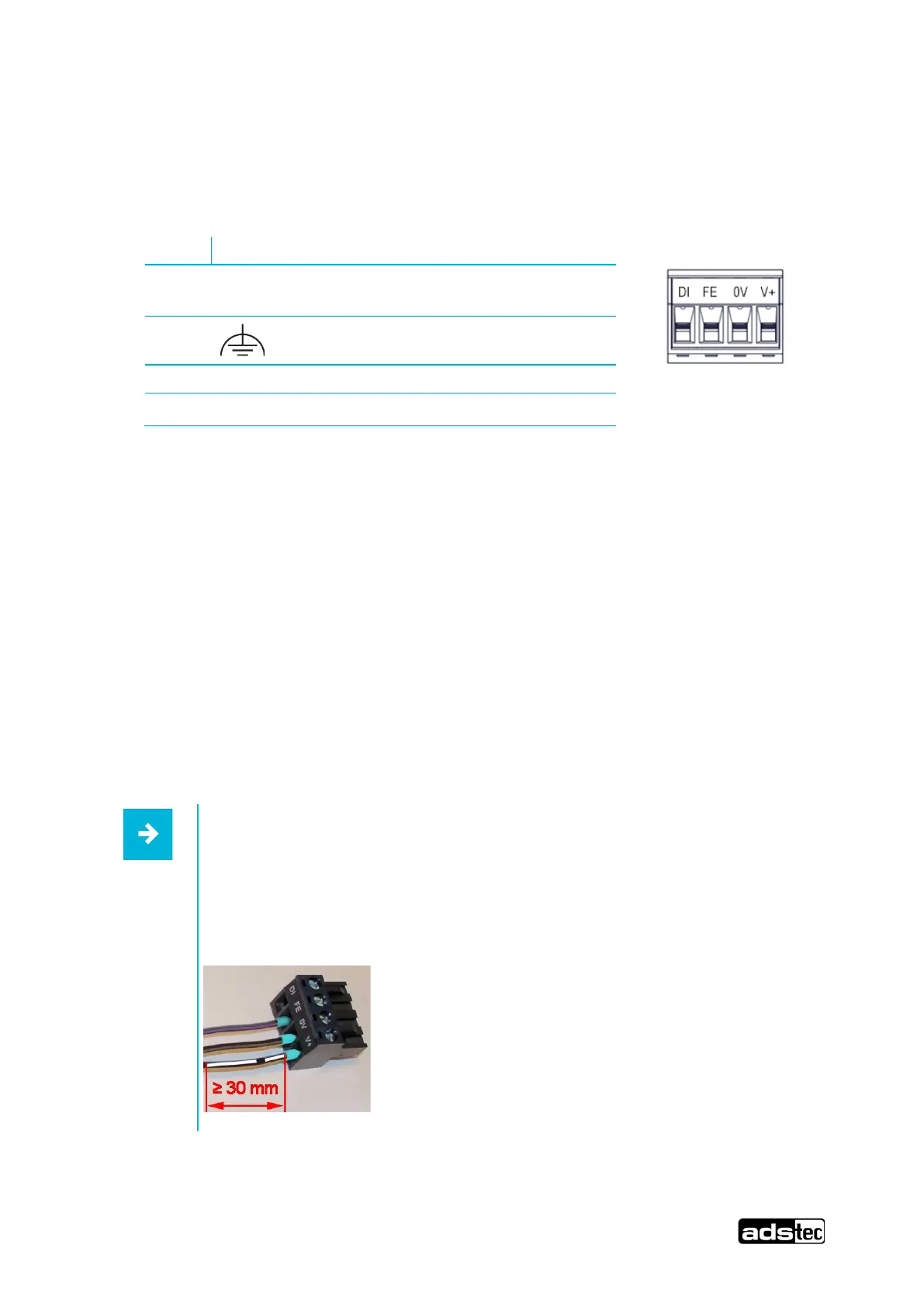 Power is fed to the device via a lead-through terminal (figure shows connector on the device).