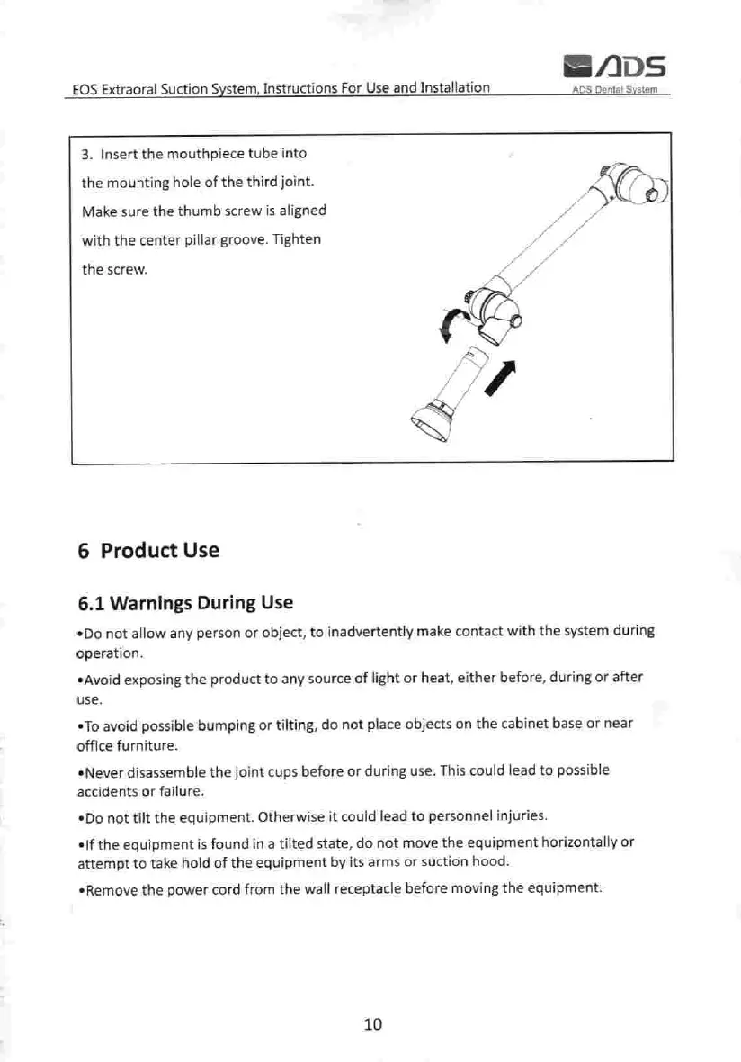 ADS EOS - Product Installation and Use; Completing Arm Assembly; Critical Operation Warnings