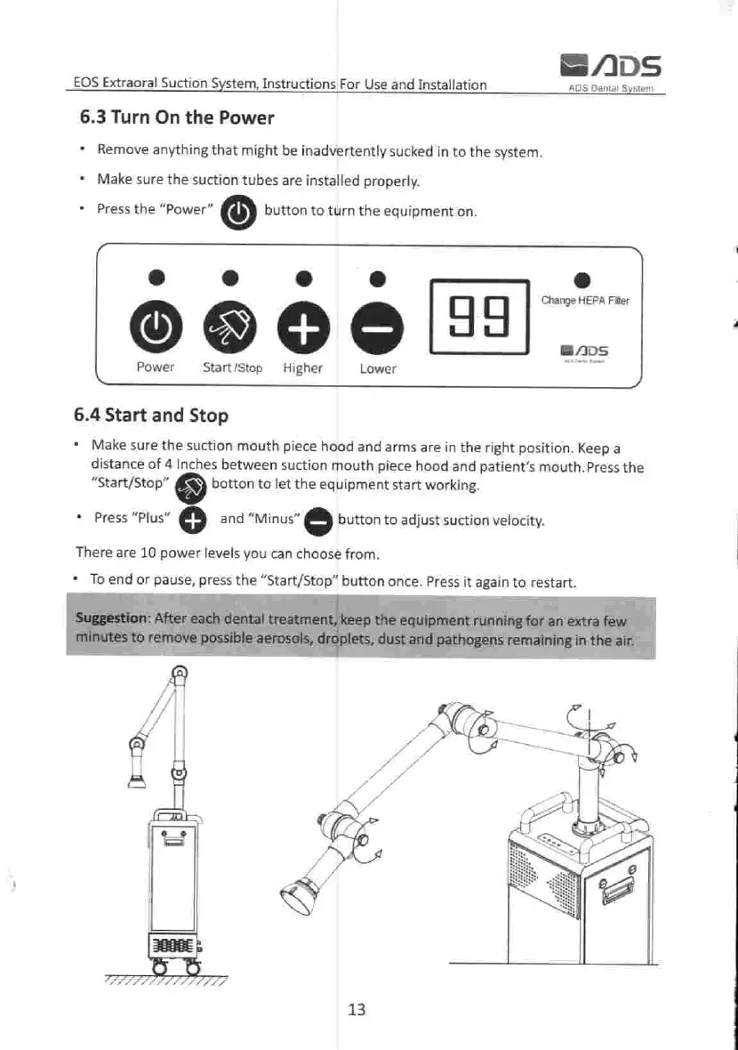 ADS EOS - Powering and Operation Control; Turning On the Equipment; Start, Stop, and Velocity Adjustment