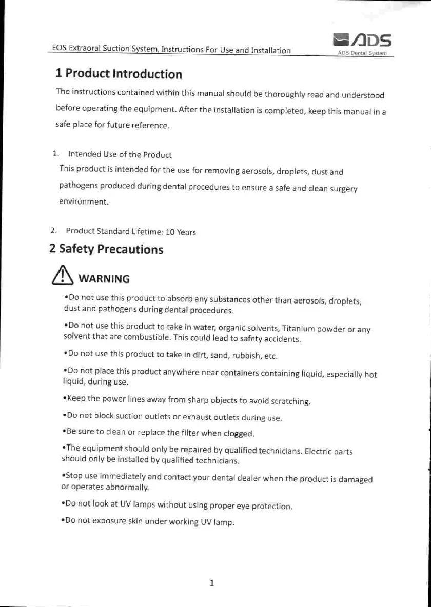 ADS EOS - Product Introduction; Intended Use of the Product; Product Standard Lifetime; Safety Precautions