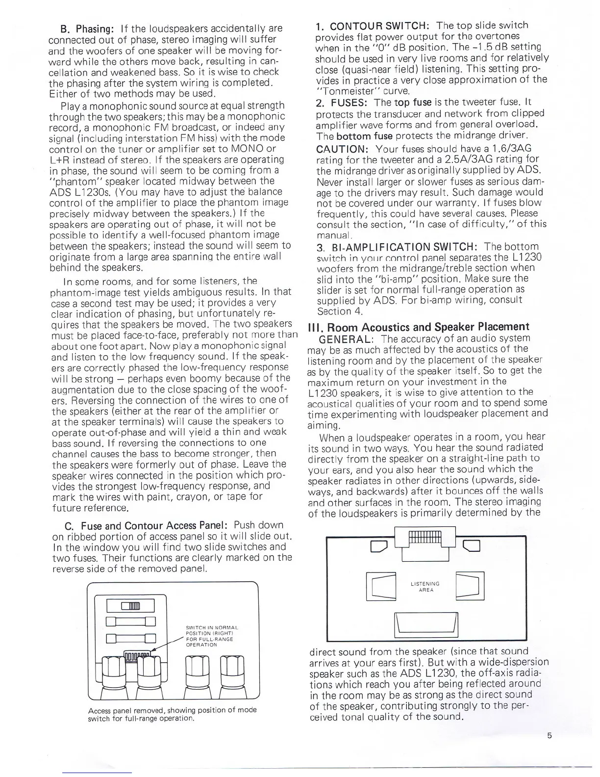ADS L420 - Speaker System Setup and Configuration; Phasing Checks; Fuse and Contour Access Panel; Room Acoustics and Speaker Placement
