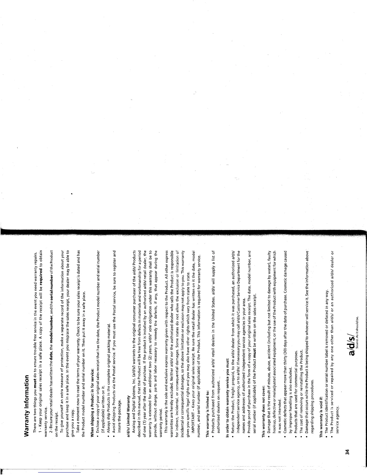 ADS M860 - Warranty Information; a;d;s; Limited Warranty Terms; Obtaining Warranty Service; Warranty Exclusions and Voiding Conditions