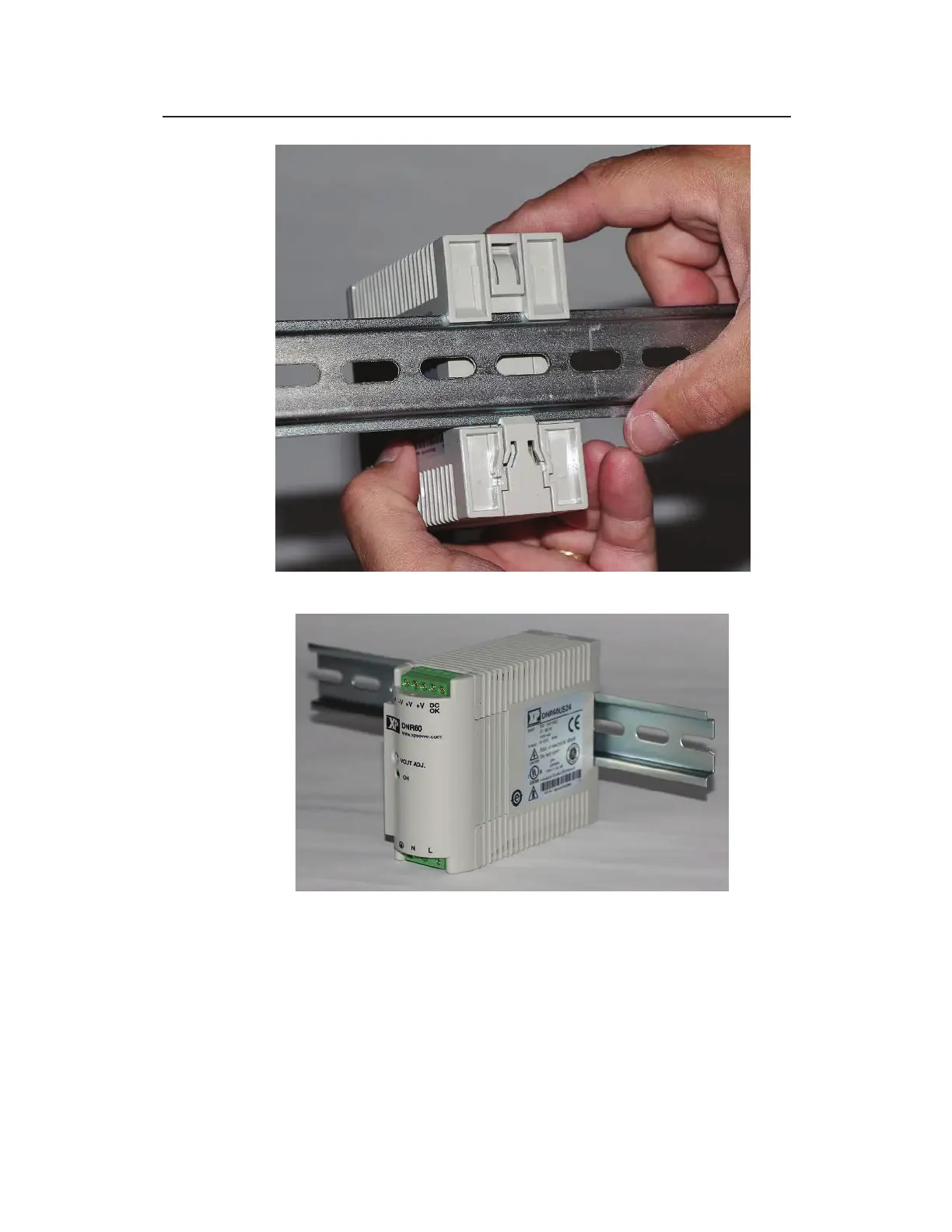 Front view of power supply mounted to DIN rail