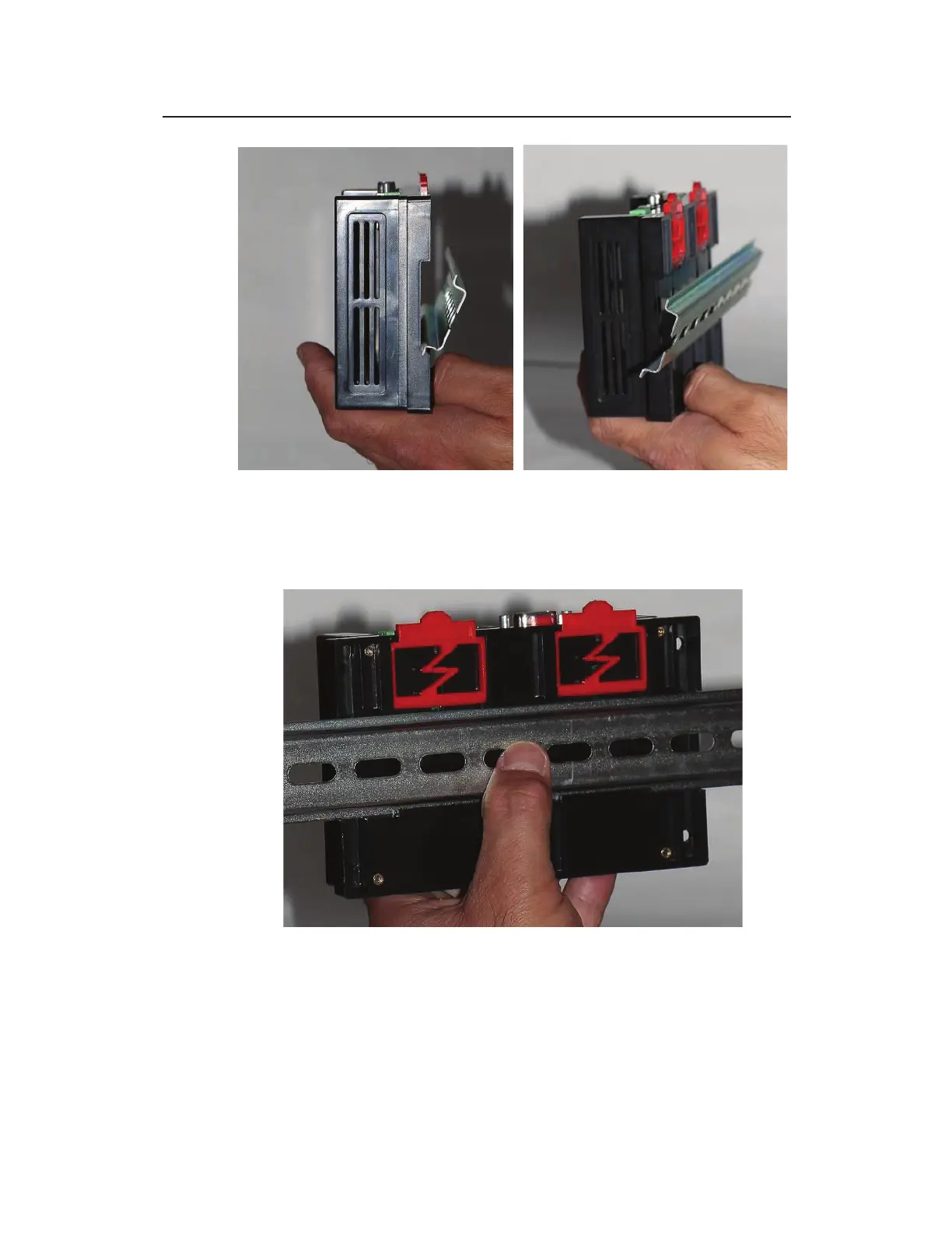 Inserting the lower edge of the DIN rail into the bottom groove on the back of