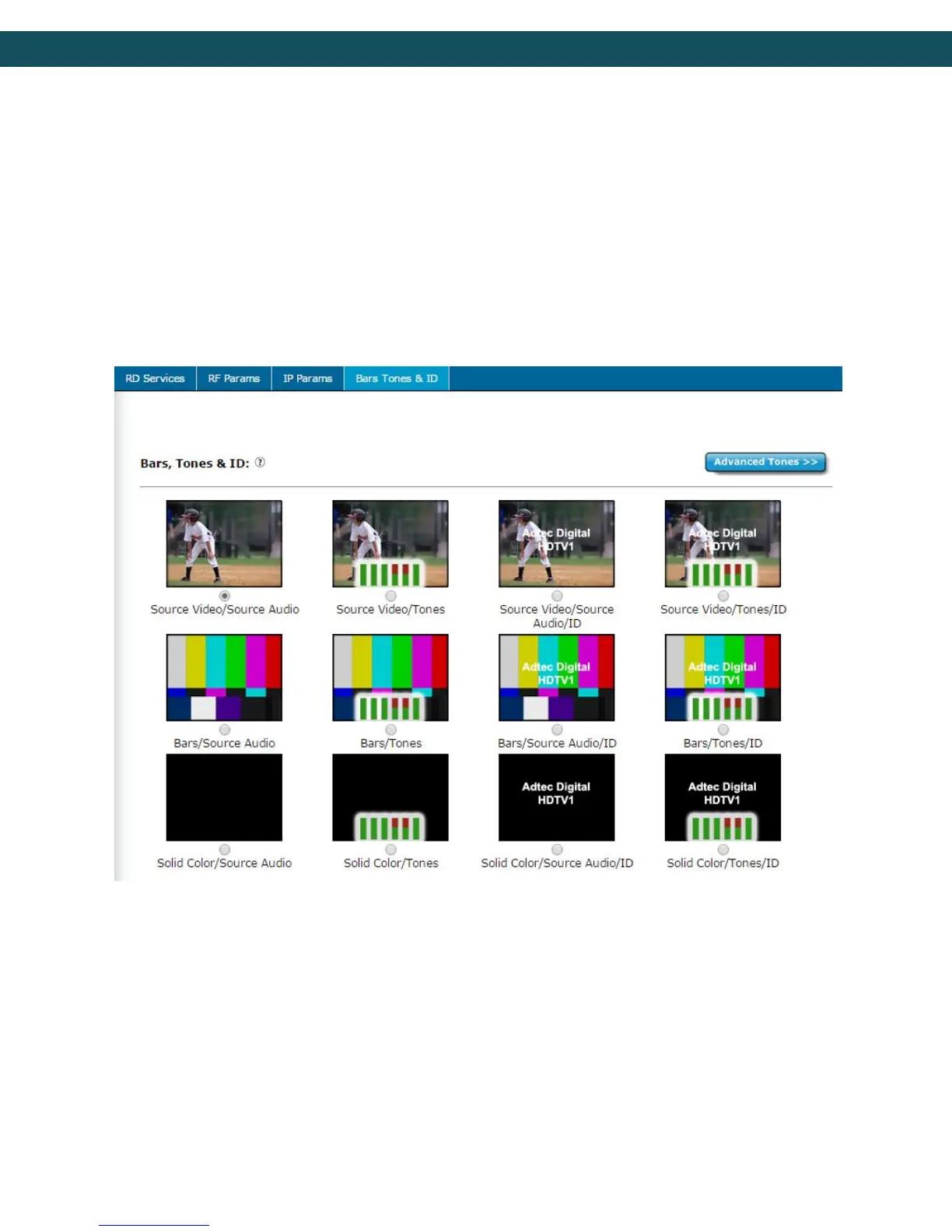 Bars Tones and ID allows an operator to ‘tag’ the video outputs for path routing verification.