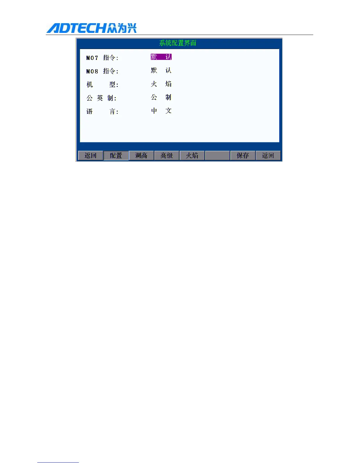 Return / Configure / Adjust height / Advance / Flame / Save / Return