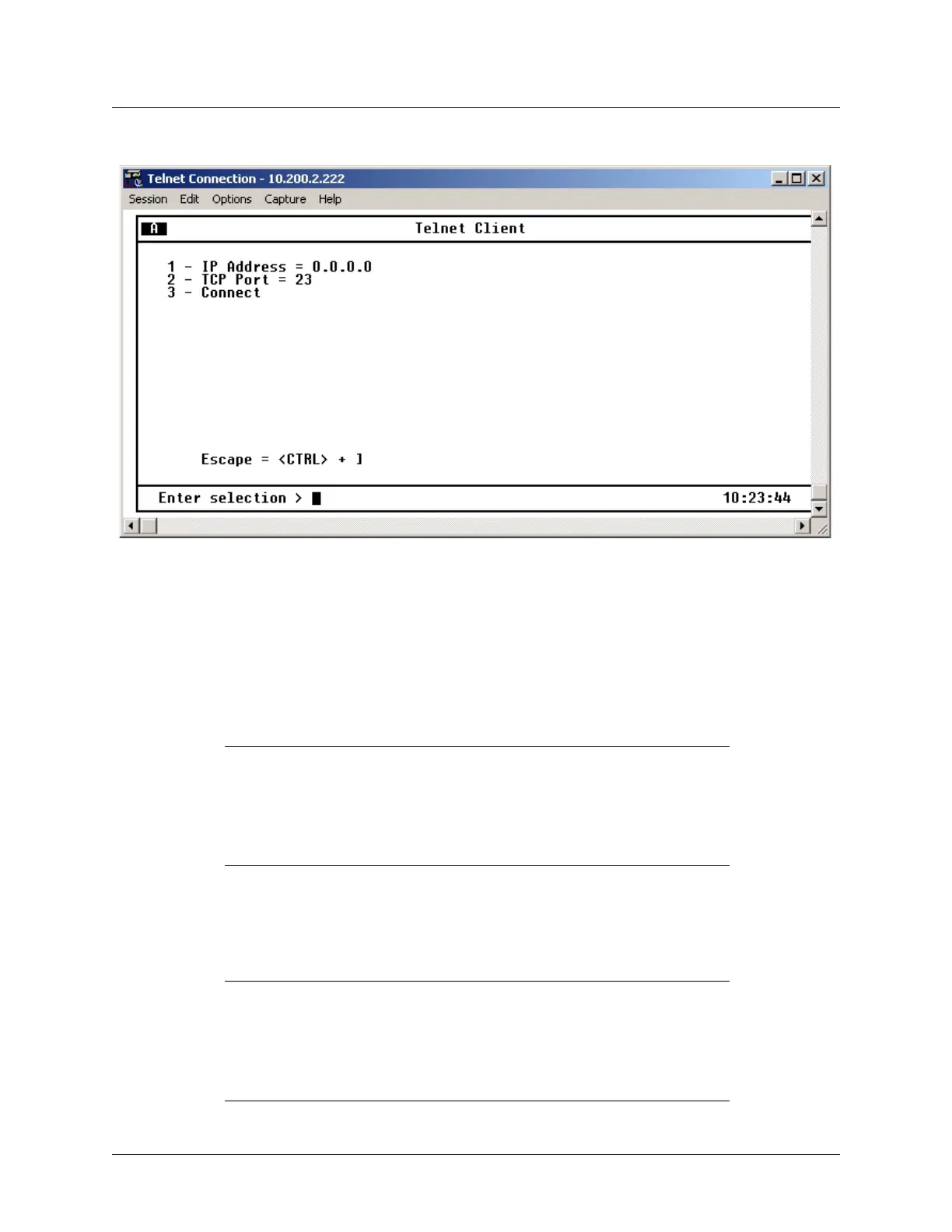 From the Telnet Client menu, specify the destination IP address and the desired TCP port number. Attempt