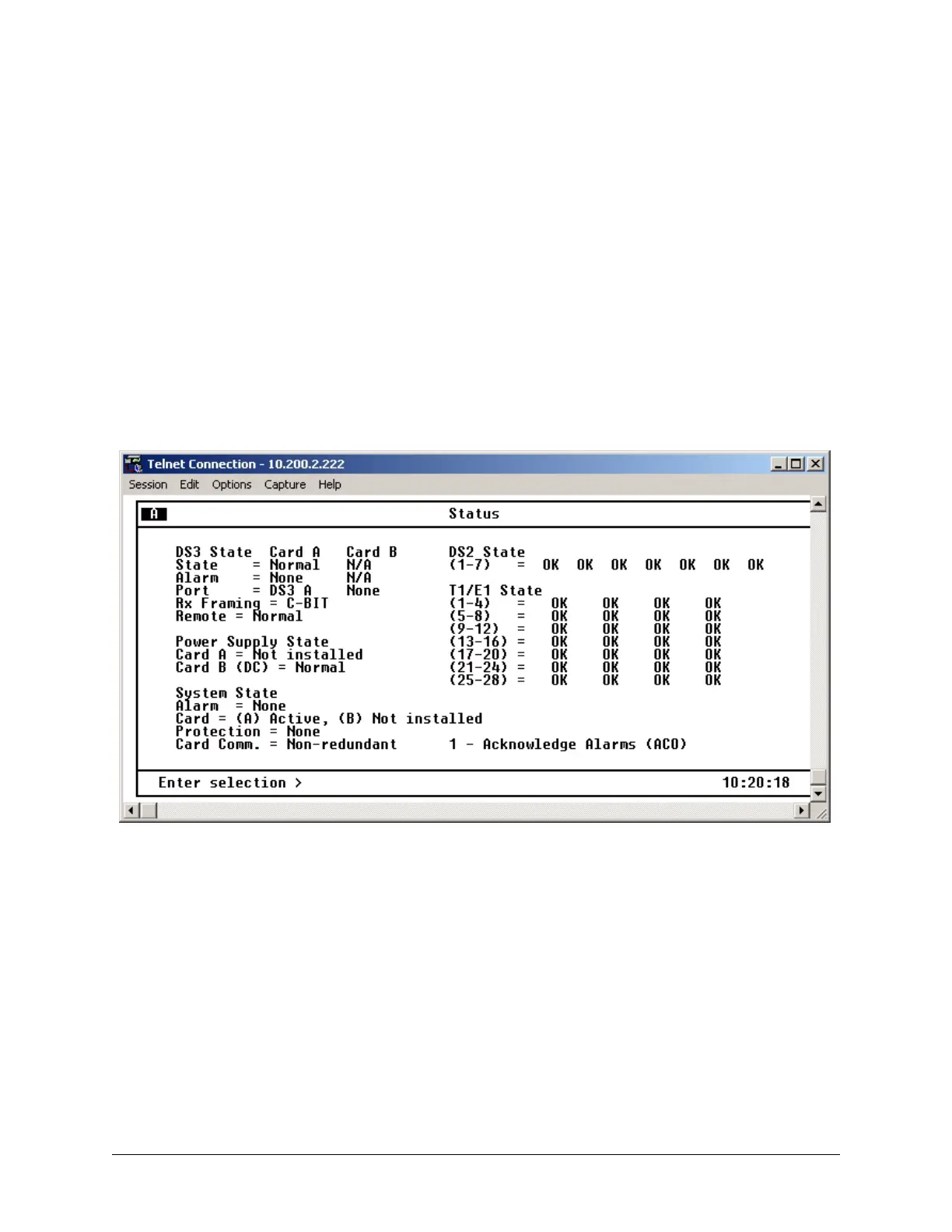 View MX2800 status information by selecting Status from the Main Menu. The information for the DS3,