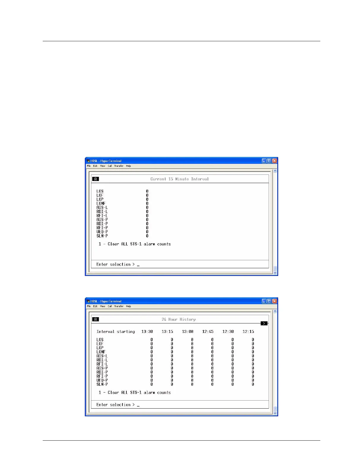 indefinitely until Clear All STS-1 Alarm Counts is selected. Figure 5-4 and Figure 5-5 show examples of