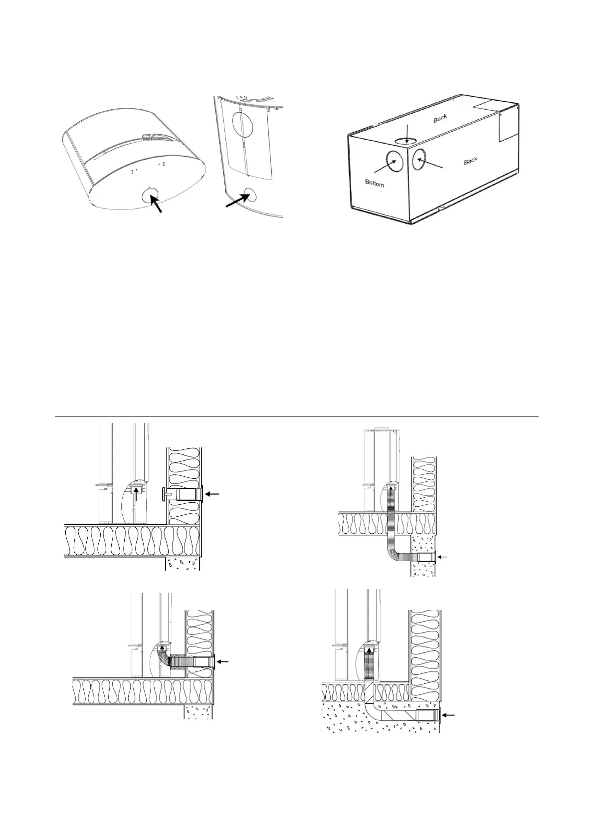 Braskaminen är byggd så att röret med extern luft kan tillslutas på kaminens baksida eller undersida (se