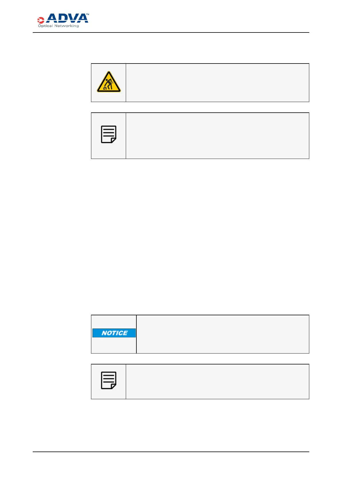 ADVA Optical Networking recommends having two people hold the shelf