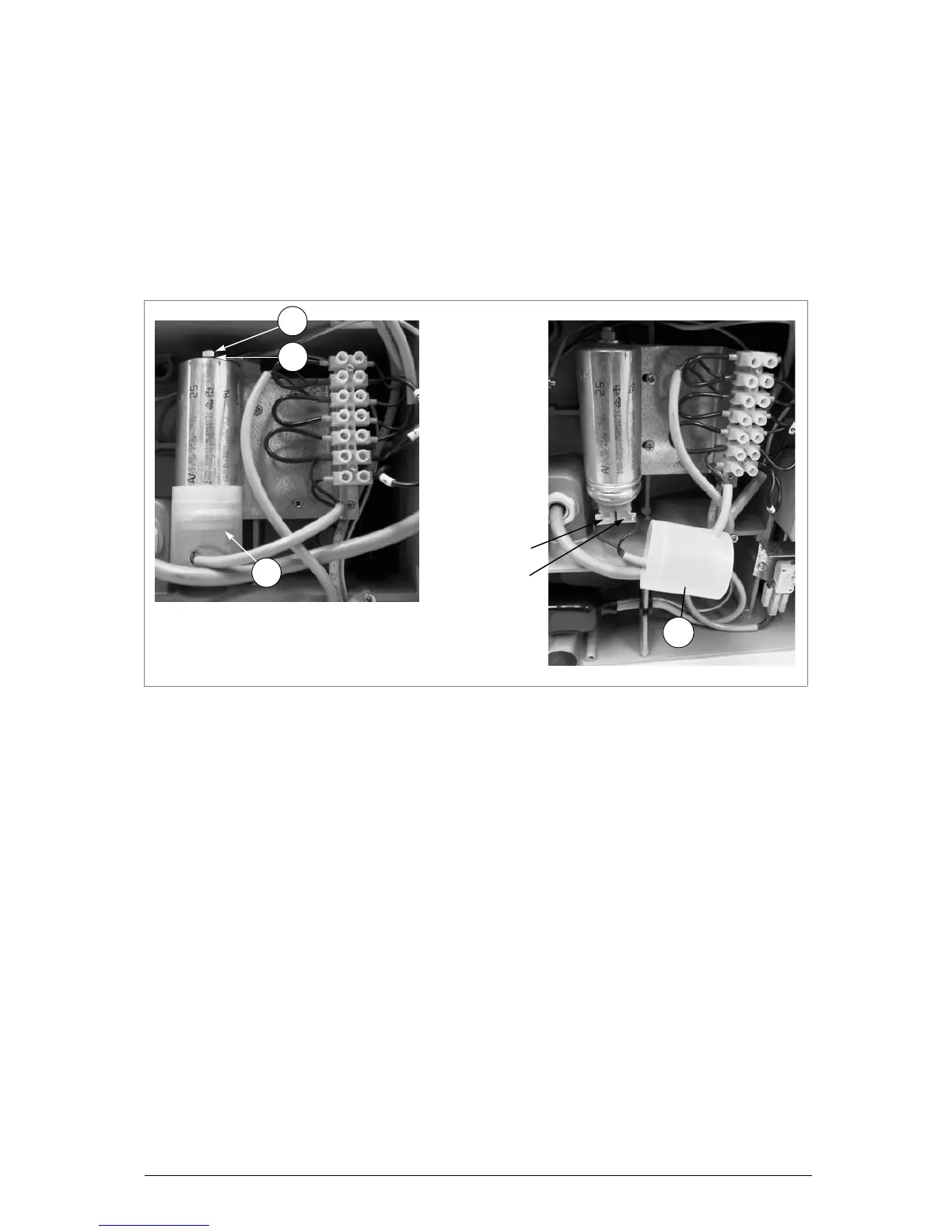 6) Remove the cap from the old condenser and detach the connectors (1 and 2) from the old