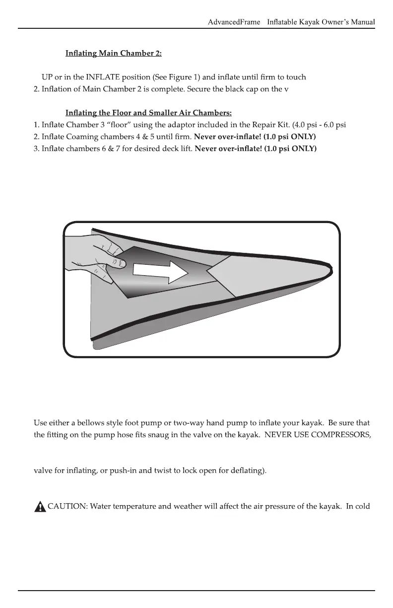 CO2, OR COMPRESSED AIR AS THEY MAY DAMAGE YOUR KAYAK. The main chambers use