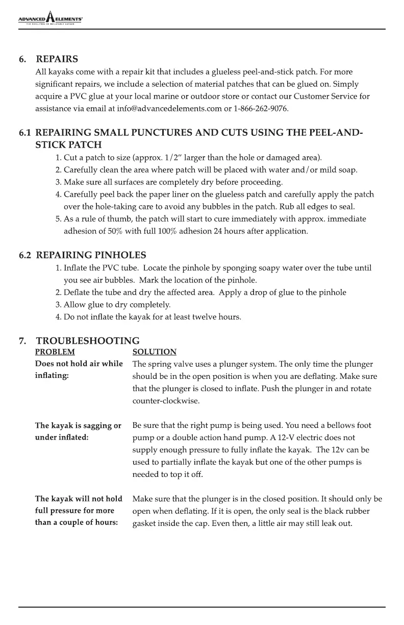 Advanced Elements ADVANCEDFRAME ELITE - Kayak Repairs; 6.1 REPAIRING SMALL PUNCTURES AND CUTS USING THE PEEL-AND-STICK PATCH