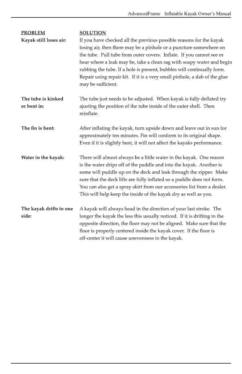 Advanced Elements ADVANCEDFRAME ELITE - Troubleshooting Common Issues; Does not hold air while inflating; The kayak is sagging or under inflated; The kayak will not hold full pressure for more than a couple of hours