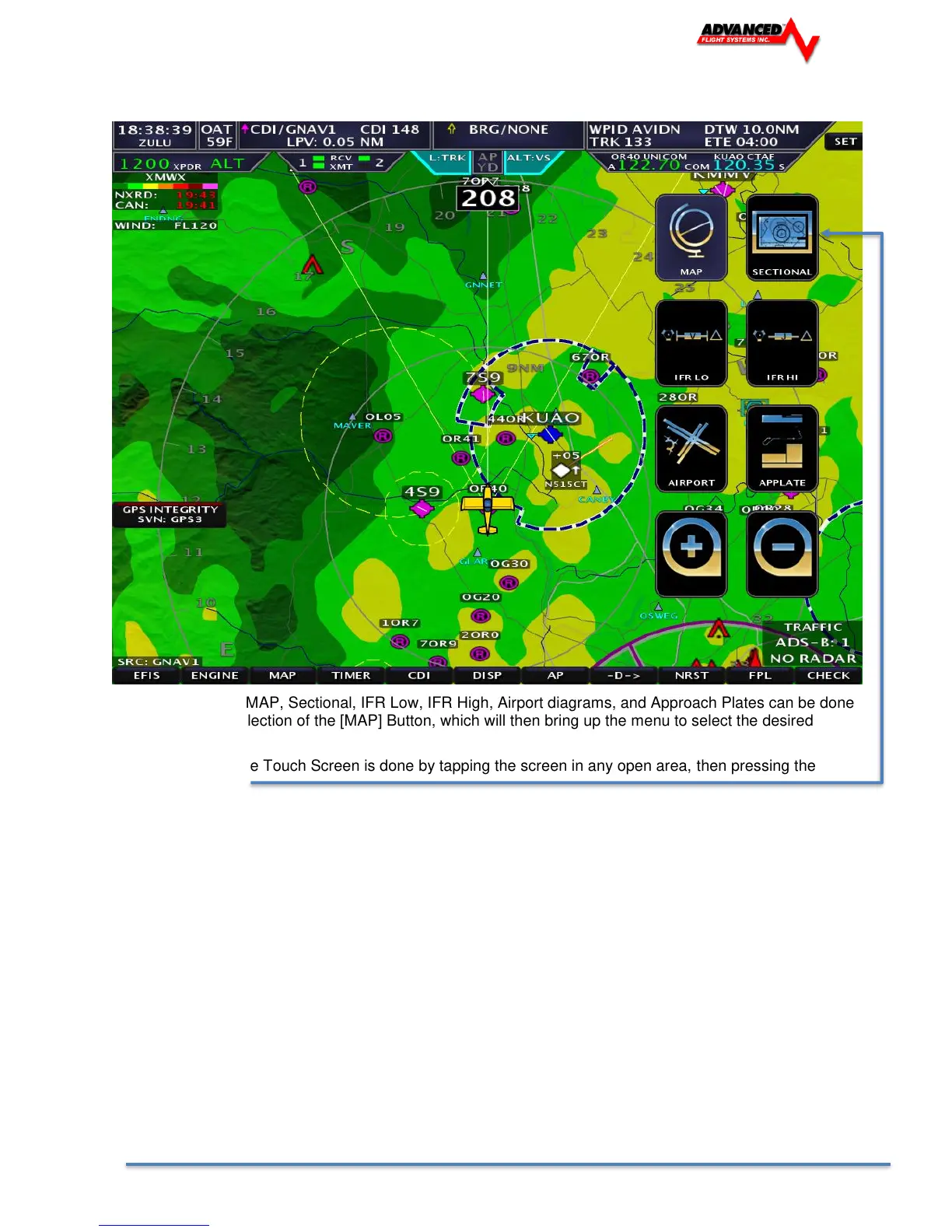 Switching between MAP, Sectional, IFR Low, IFR High, Airport diagrams, and Approach Plates can be done