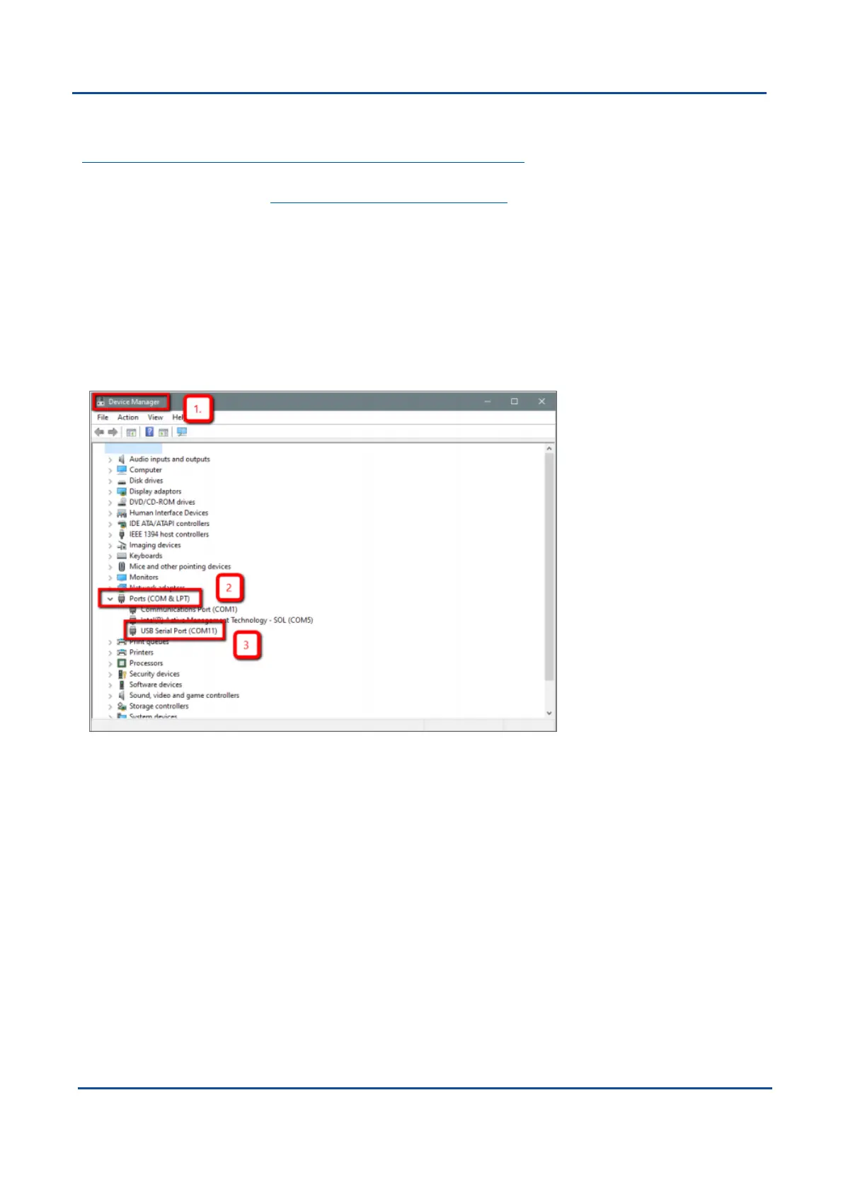 1. Start the Windows Device Manager (1) and find the Ports section (2).