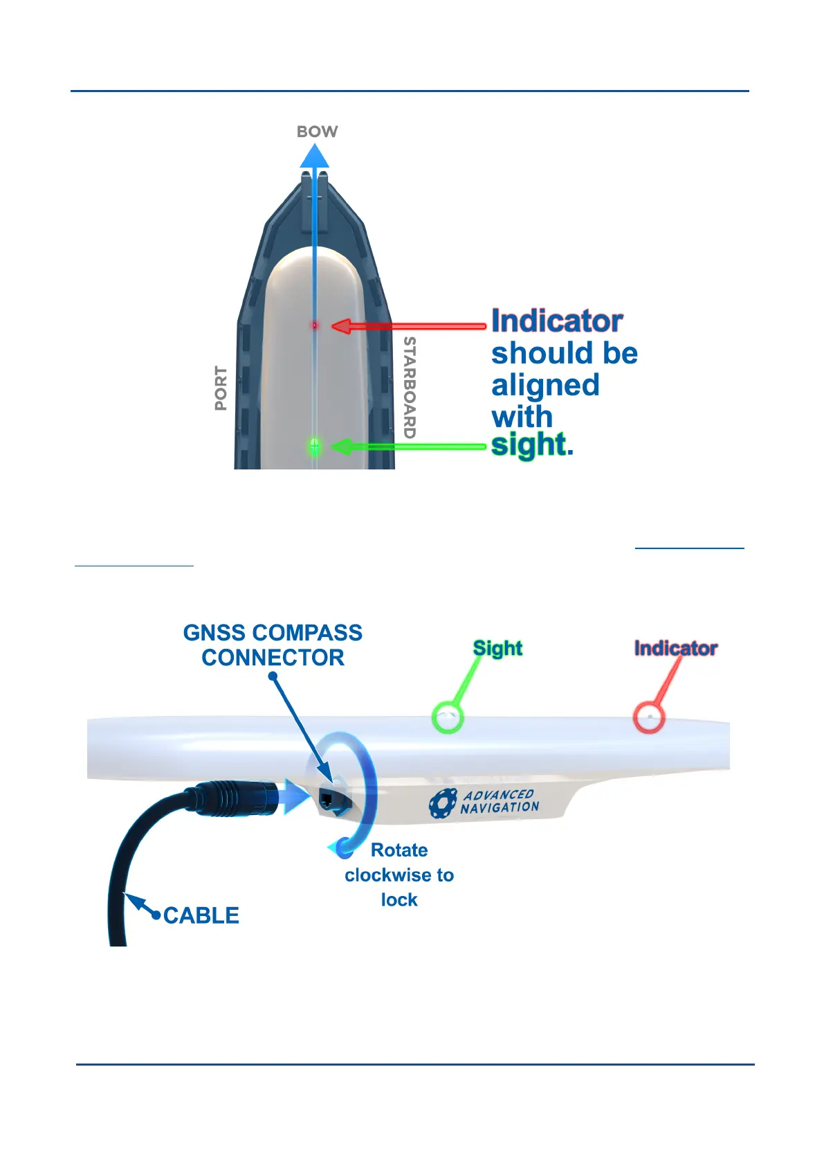3. Plug the cable into the GNSS Compass and rotate the nut clockwise to lock it in place. See GNSS Compass