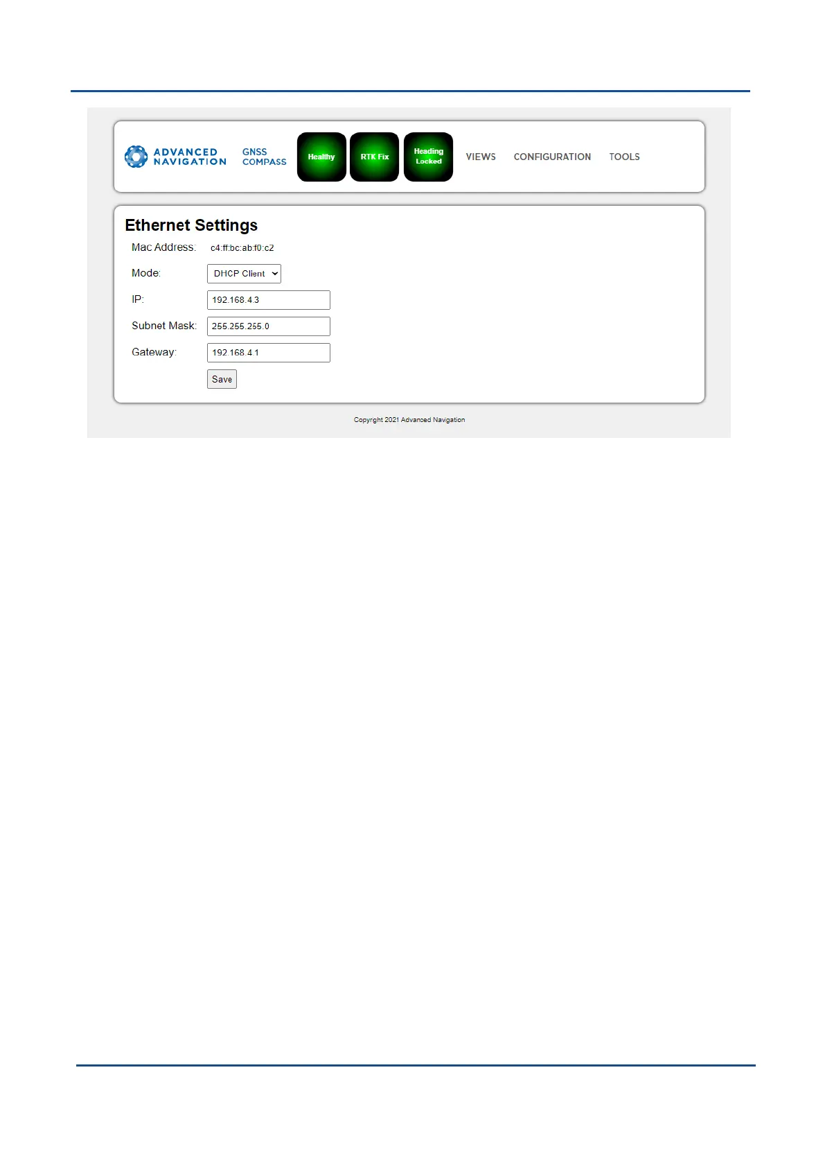 Figure 33: GNSS Compass Web UI Ethernet Settings page