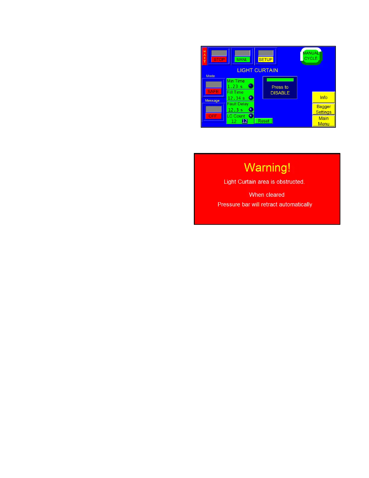displayed and machine operation is stopped. For operation to continue after a blockage occurs, the Light Curtain