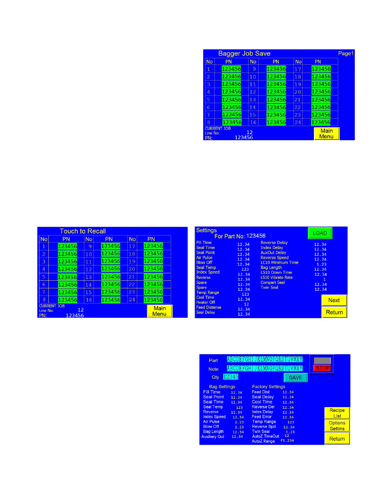 45. Ensure this is the correct job and touch <Load>. This will take you to the Bagger Settings screen with all the