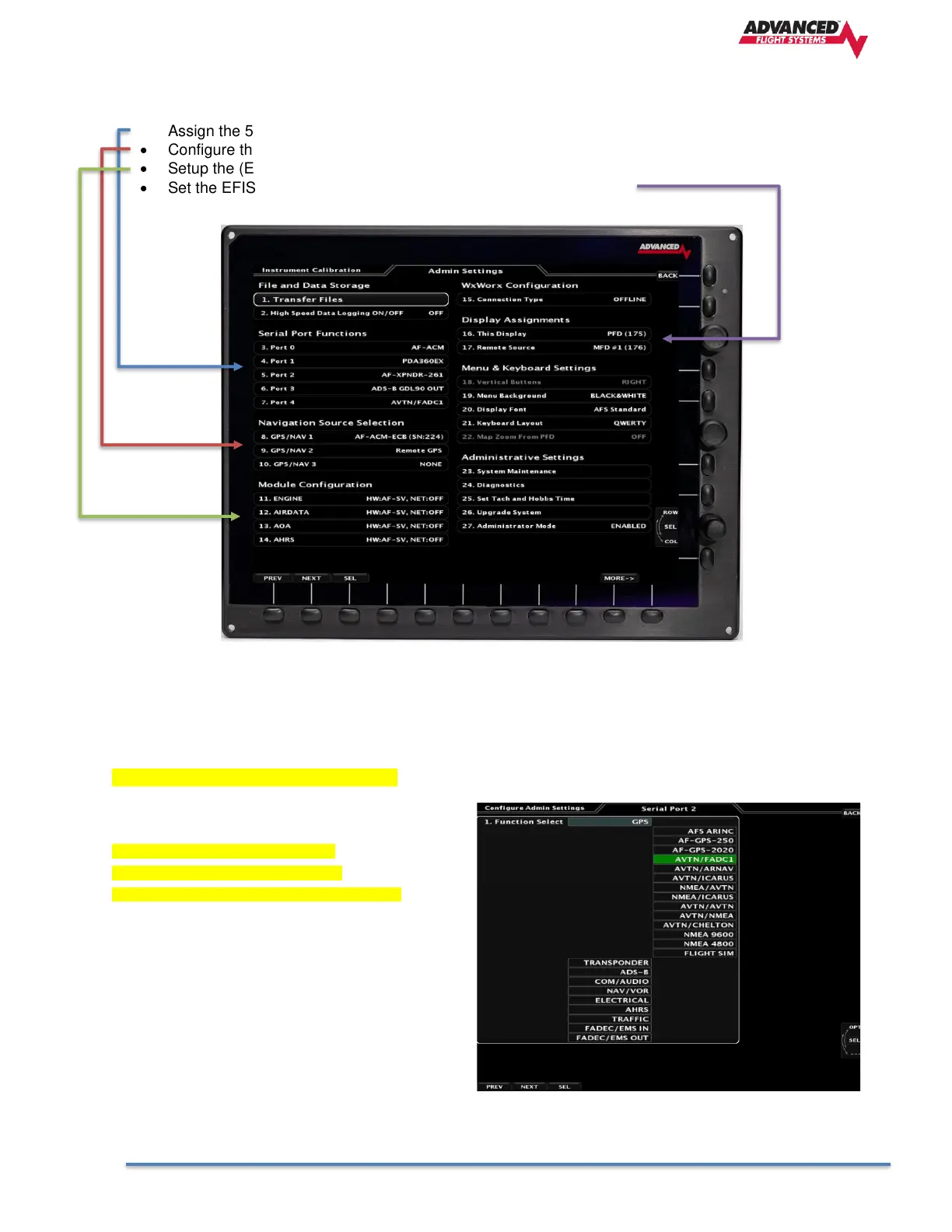 Using your system block diagram (schematic) that shows which device is wired to each EFIS serial port