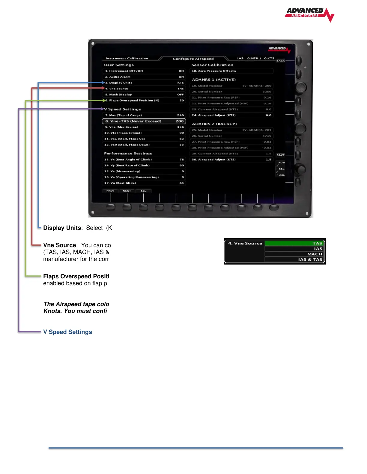 The Airspeed tape color range settings should be adjusted for your aircraft. All the speeds are in