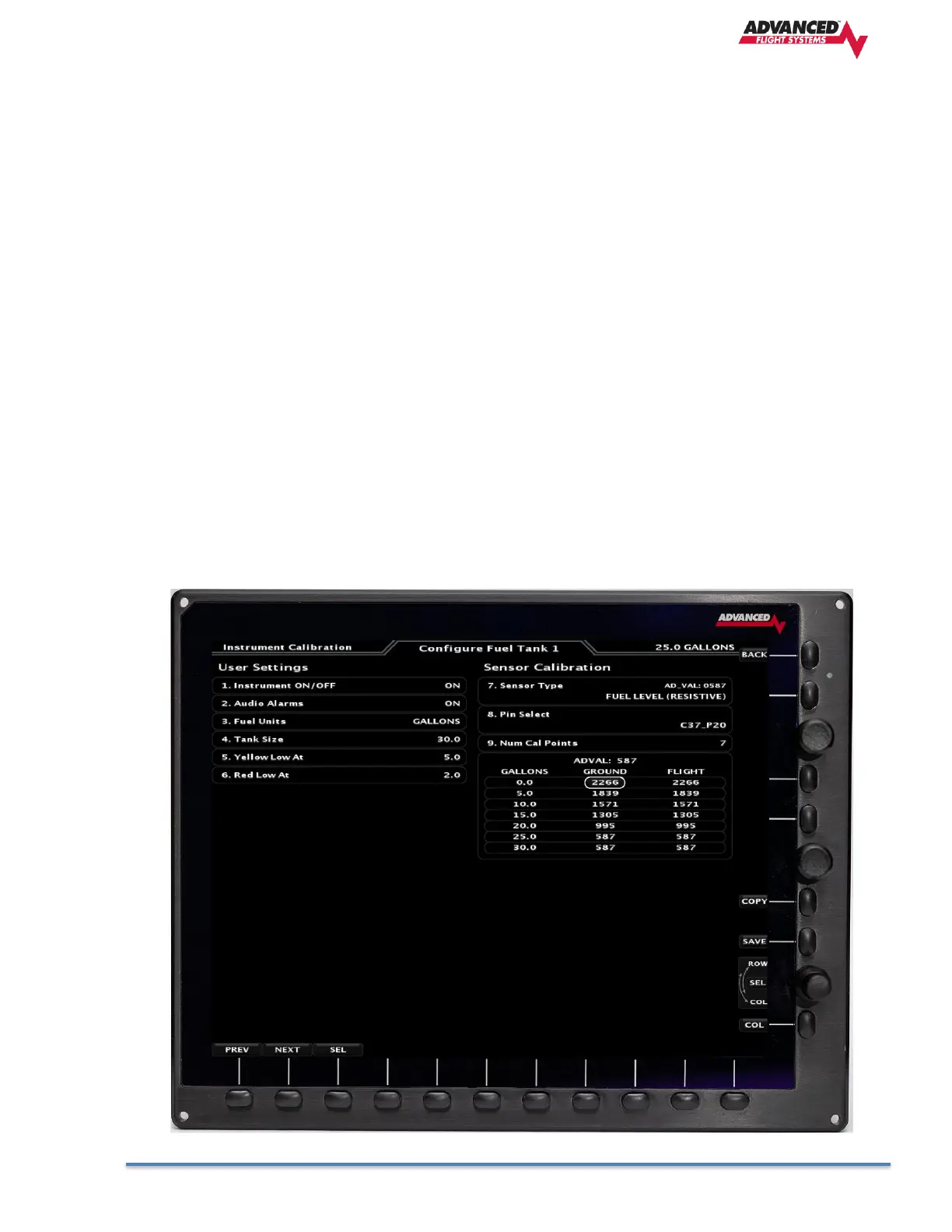 switch between ground and flight data columns. The current ADVAL (digital value of