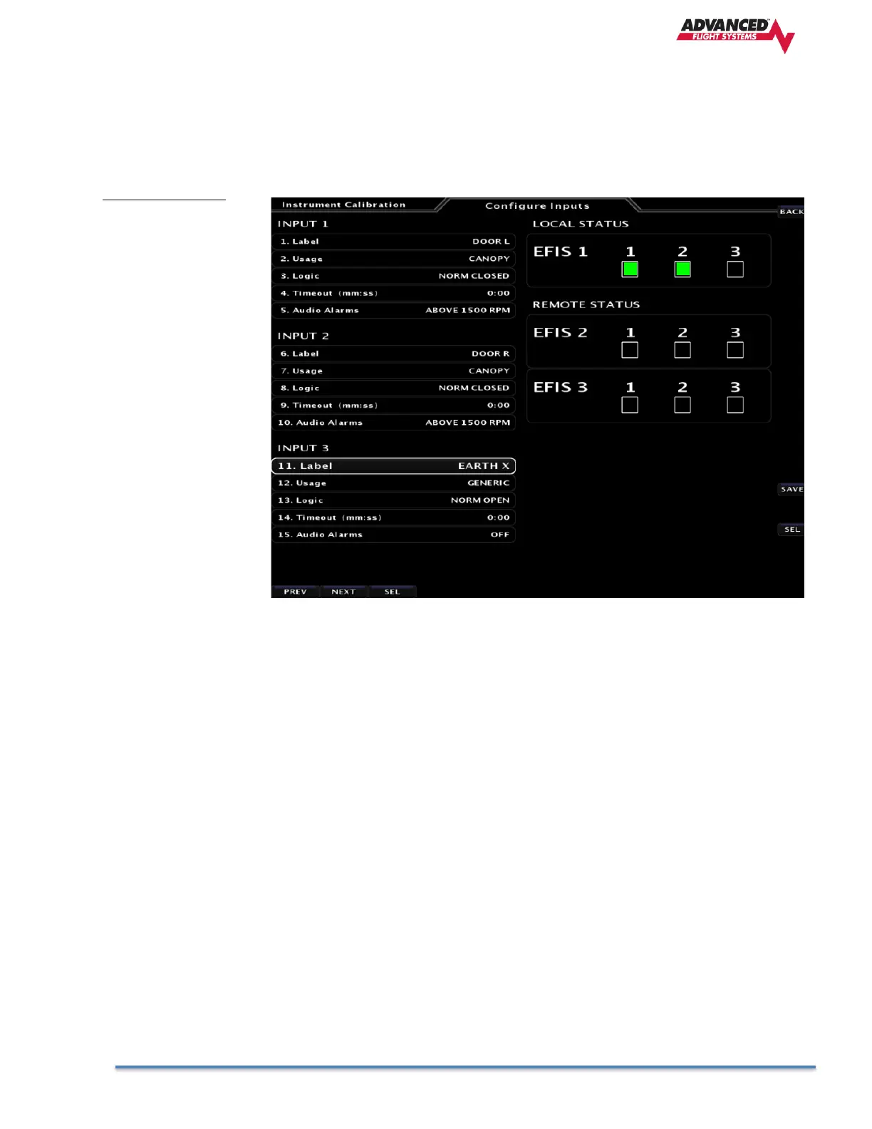 Each EFIS screen has 3 hardware inputs that can be used to monitor an external switch. To activate the