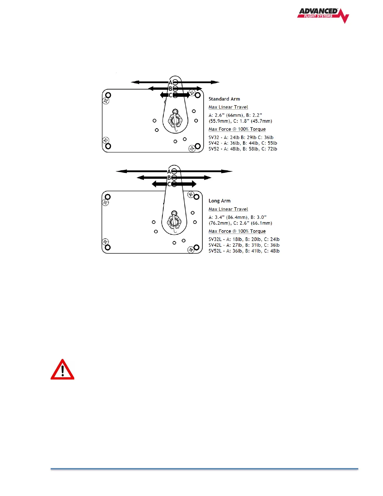 The two diagrams below illustrate the maximum travel and force available at each linkage mounting