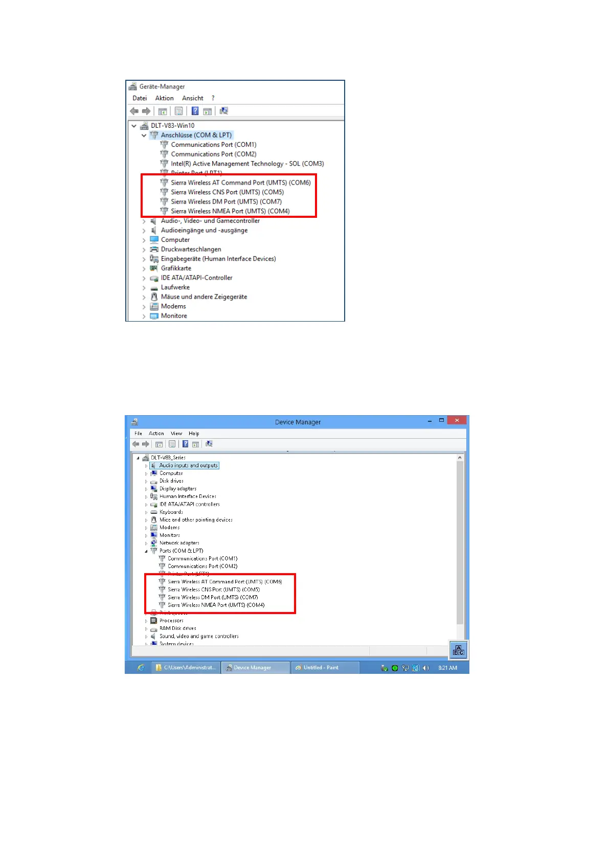 Advantech-DLoG DLT-V8312 - Fig. 12.11: SIERRA WIRELESS MC80 - Virtual COM Ports DLT-V83 with I5 Processor; Fig. 12.12: SIERRA WIRELESS MC80 - Virtual COM Ports DLT-V83 with Celeron Processor