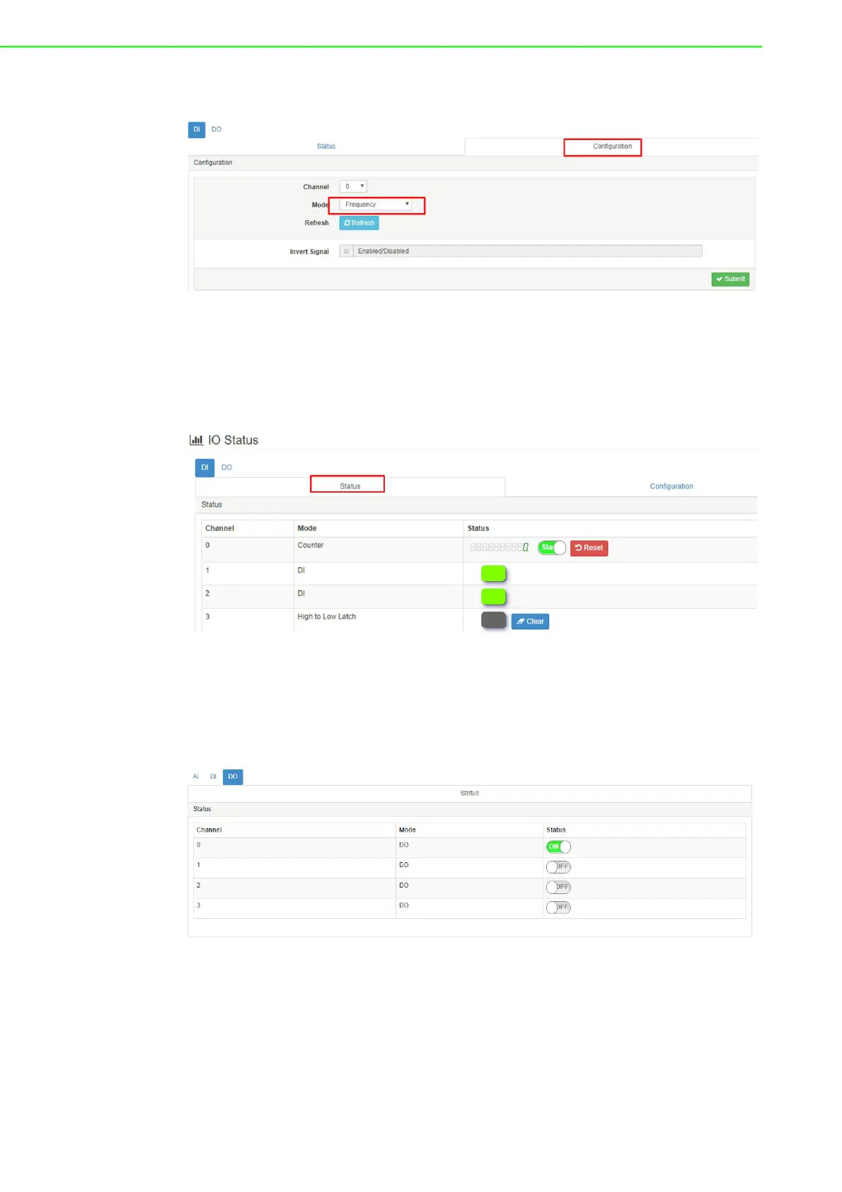 Status: Shows the status of the digital outputs; green = on, grey = off