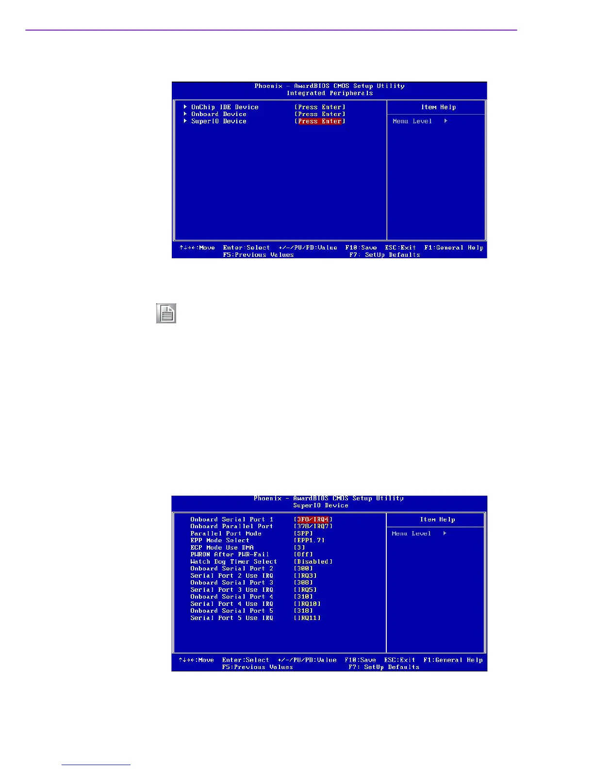 Note! This “Integrated Peripherals” option controls the configuration of the