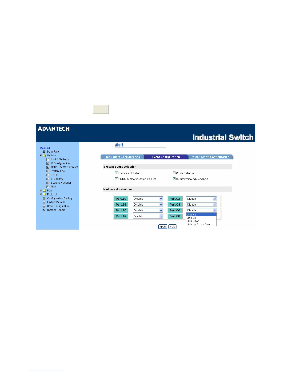• Port event selection: Select the port events for each port that has 3 selections – Link UP, Link Down,