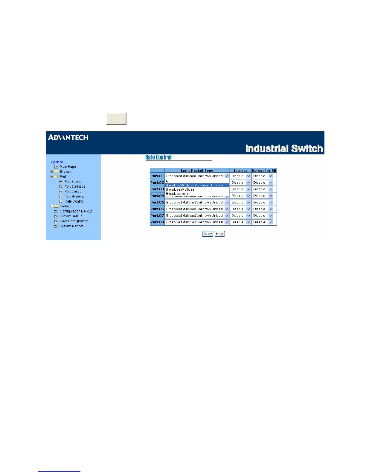 Here you can set up every port’s packet limitation type and bandwidth rate.