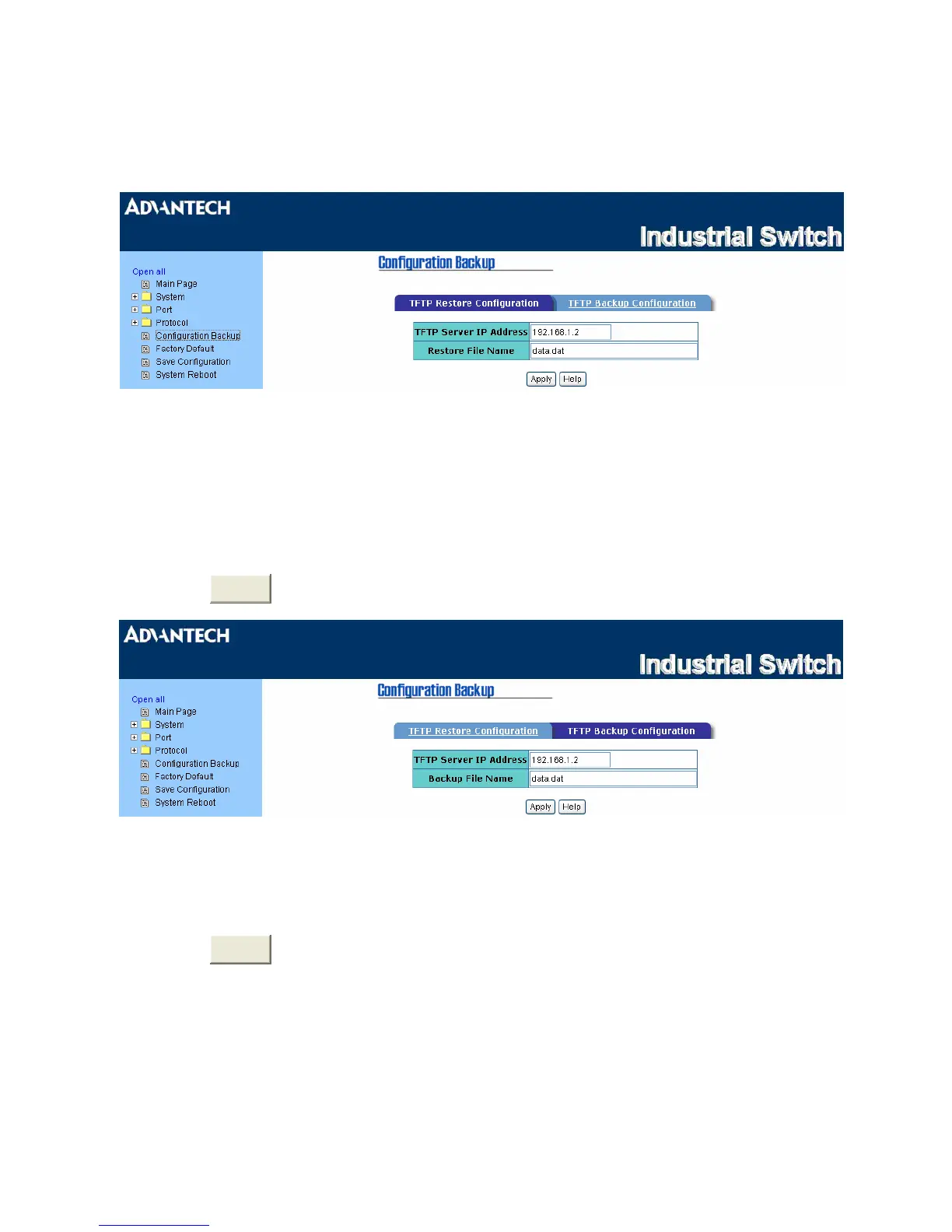 This interface allows users to back up the current configuration on the switch to the TFTP server. Also,