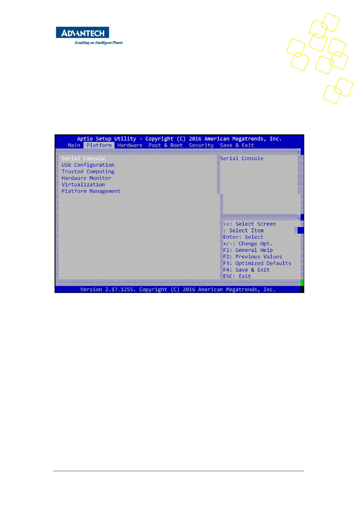 The Platform BIOS Setup screen is shown below. The sub menus are described on the