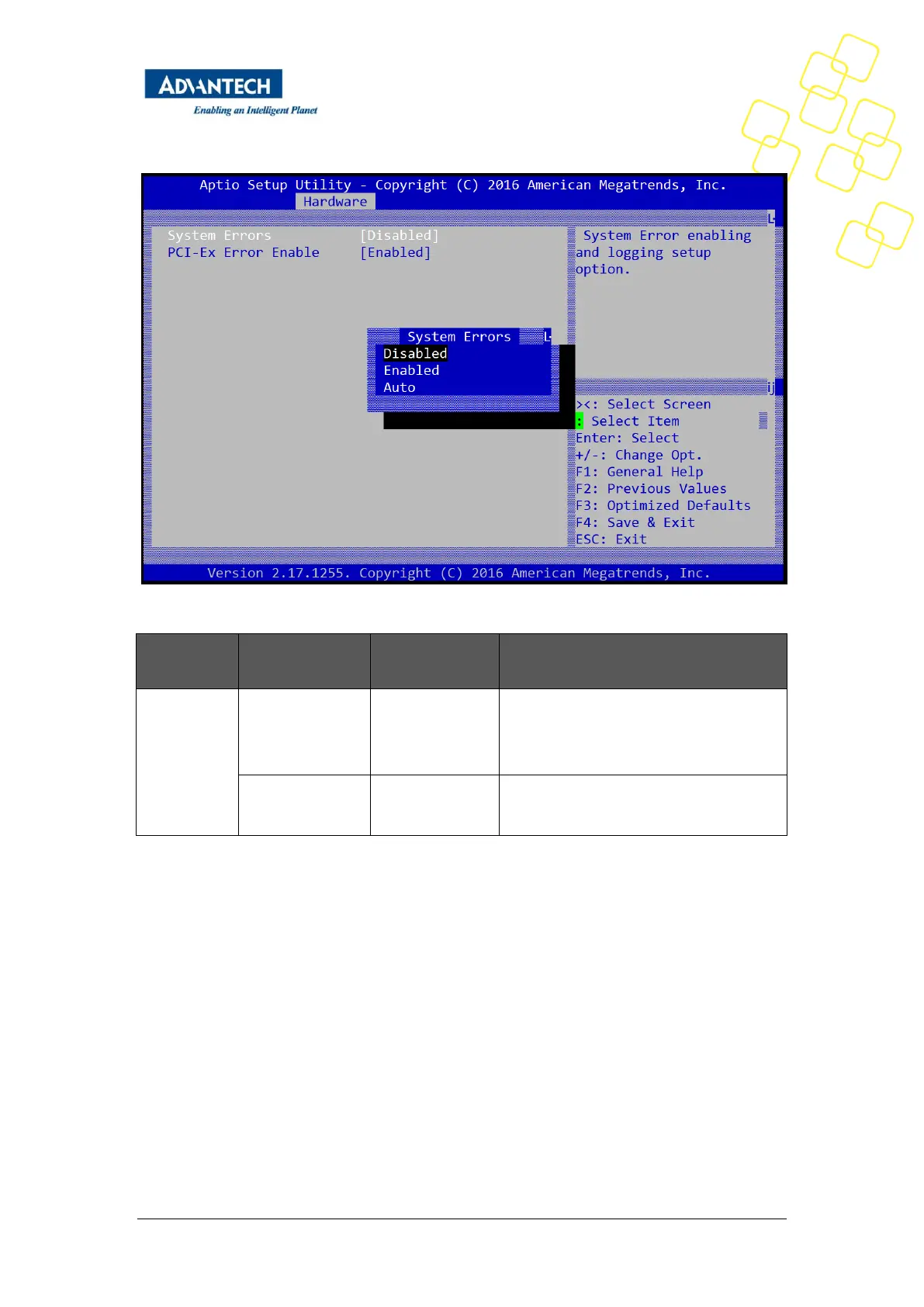 Advantech FWA-3260 - Figure 42: Hardware Setup: Runtime Error Logging Configuration; Server Mgmt; Table 40: Hardware Setup: Runtime Error Logging Menu Items