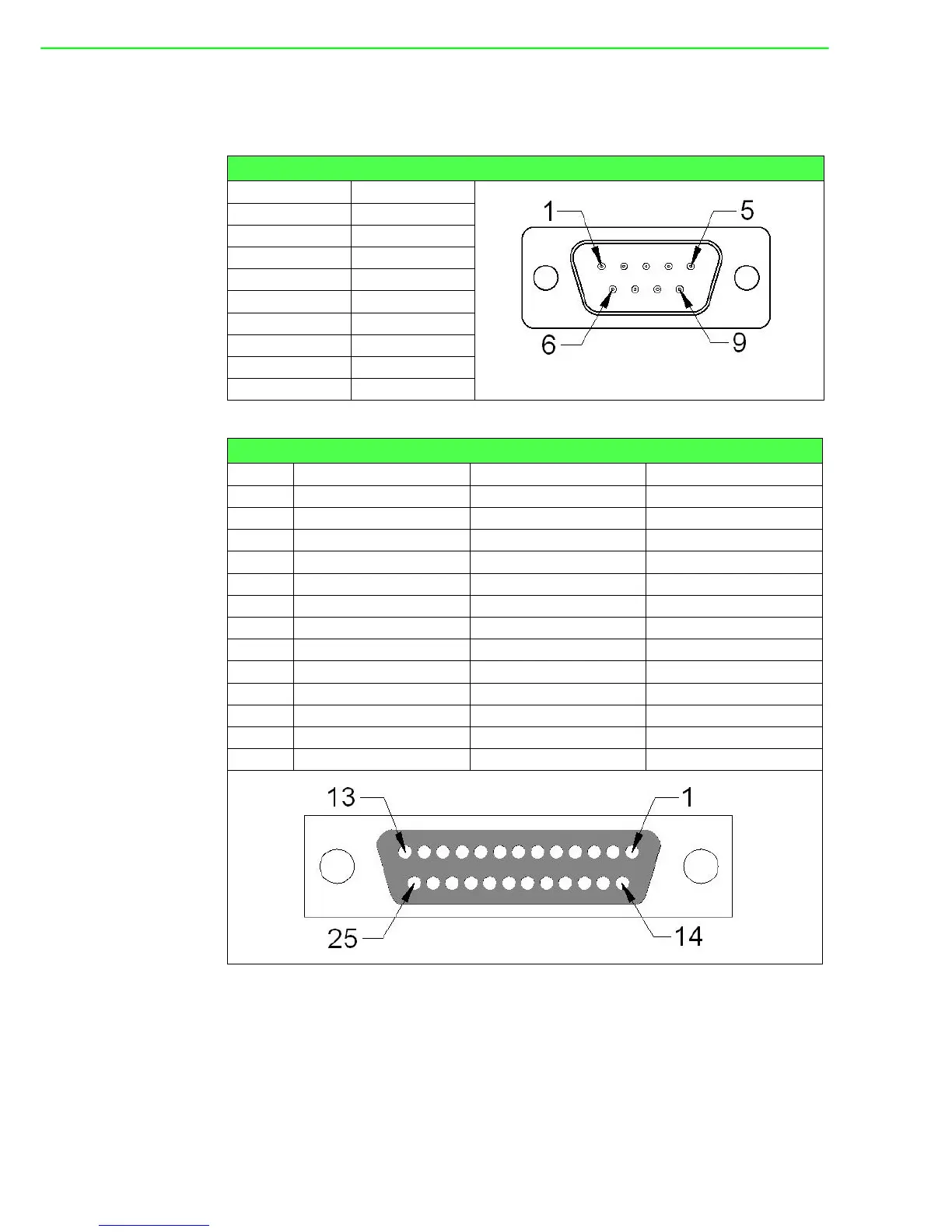 The following tables and figures show the pin assignments of 1 female DB25 connec-