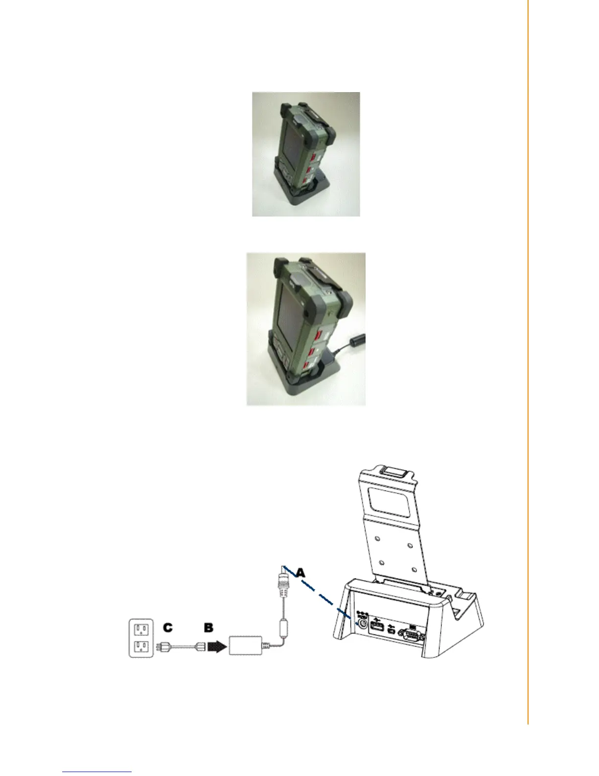 2. Plug the AC adapter cable into the power connector on the cradle (A).