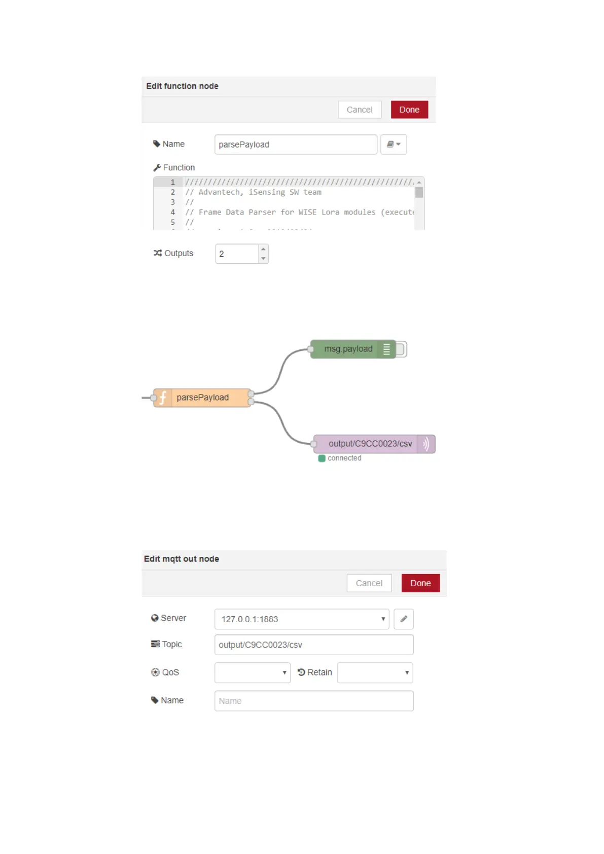 ii. Place a MQTT out node and connect it with “parsePayload“ node.