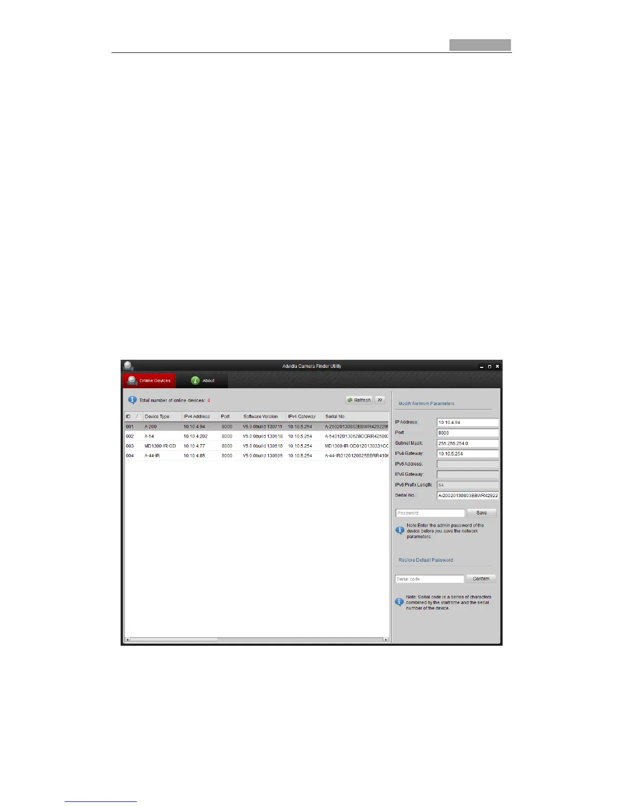 in the Online Devices interface. Device information including the device type, IP