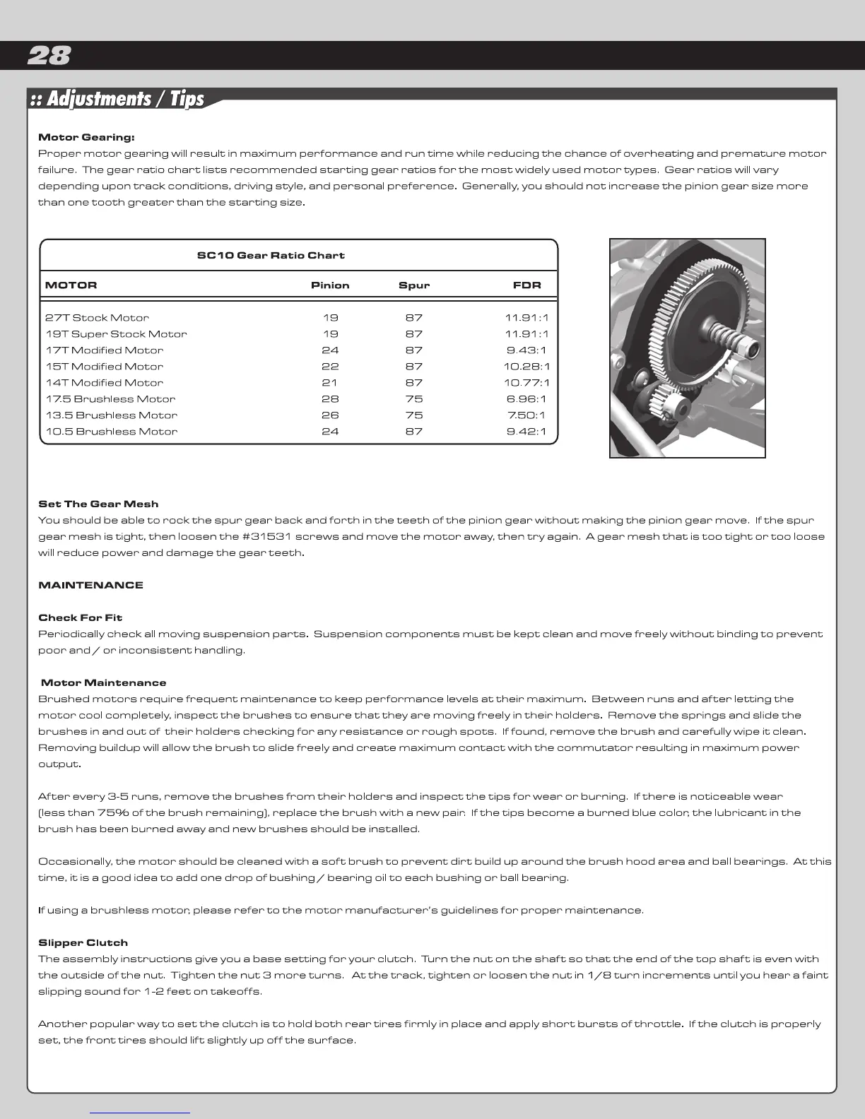AE SC10 - Adjustments and Tuning Tips; Motor Gearing Guide; Setting the Gear Mesh; General Maintenance Procedures