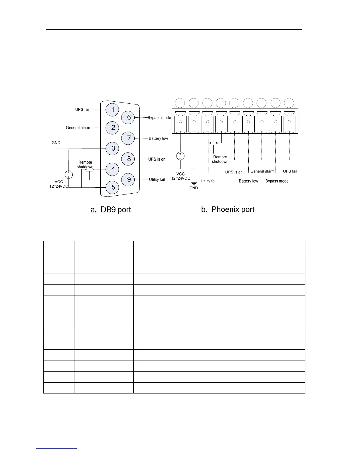 6 Bypass mode Pin6 to pin5 is NC if UPS works in bypass mode. If not, NO.